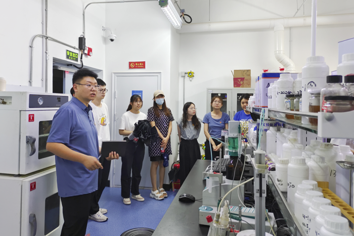 随后,在总工程师崔正的带领下,师生参观了华腾新材办公场所、产品陈列、实验室等,促进了学生们对理论知识与生产应用相结合的感知,也对实验室安全管理有了更加直观的认识。