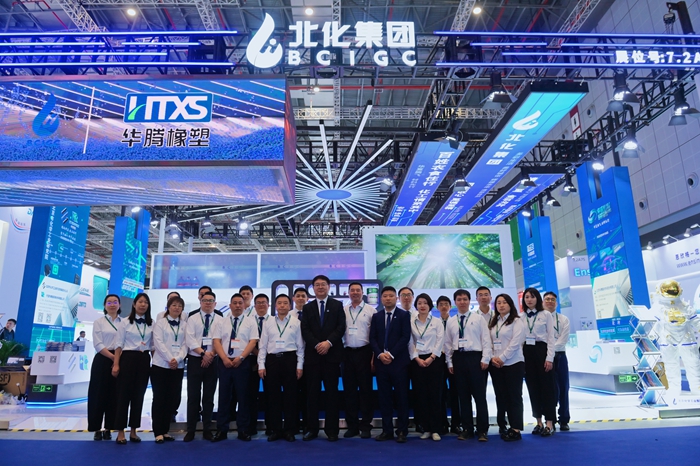 展会期间,九游网页版党委副书记、董事、总经理杨旭辉,副总经理张荣寰,总会计师金黎明也来到集团展台参观指导。杨旭辉一行听取了现场各企业的详细介绍,深入了解现场展示的储氢瓶内胆材料、LNG船用胶、航天手套等高精尖产品,亲切慰问现场工作人员。